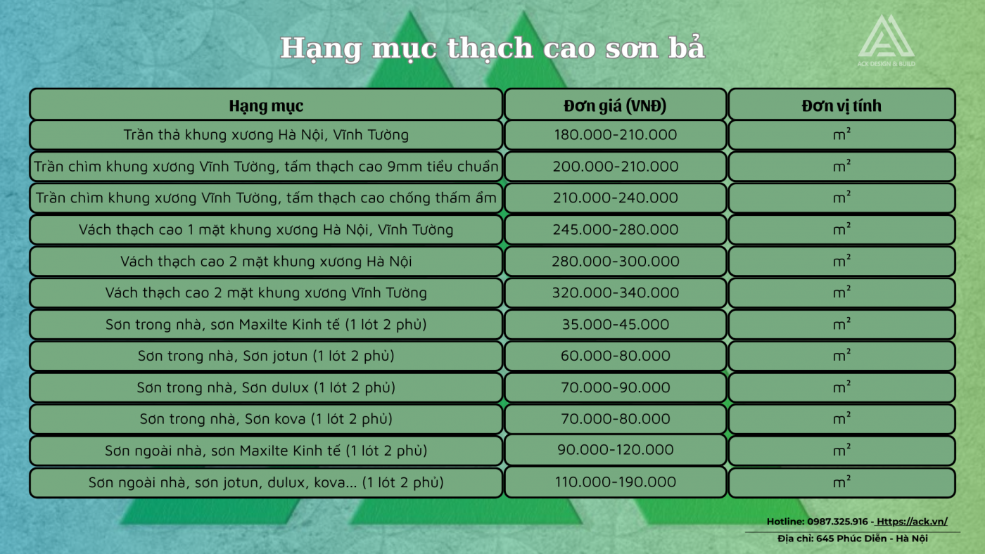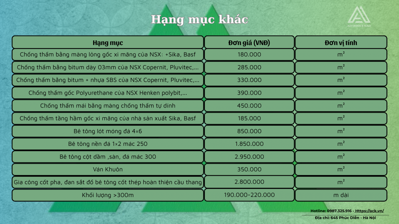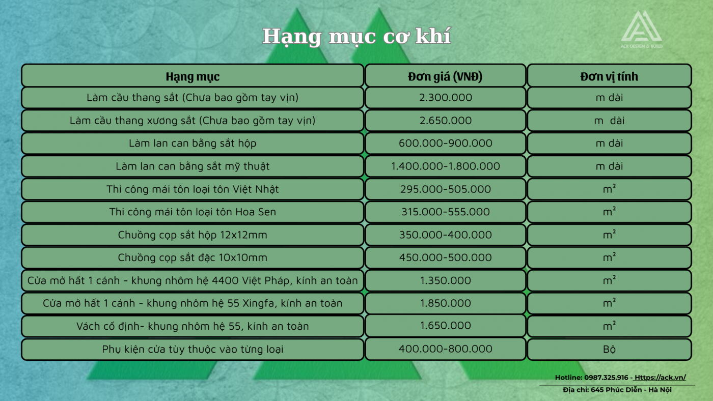 Dưới đây là báo giá một số hạng mục chính mời quý khách tham khảo!